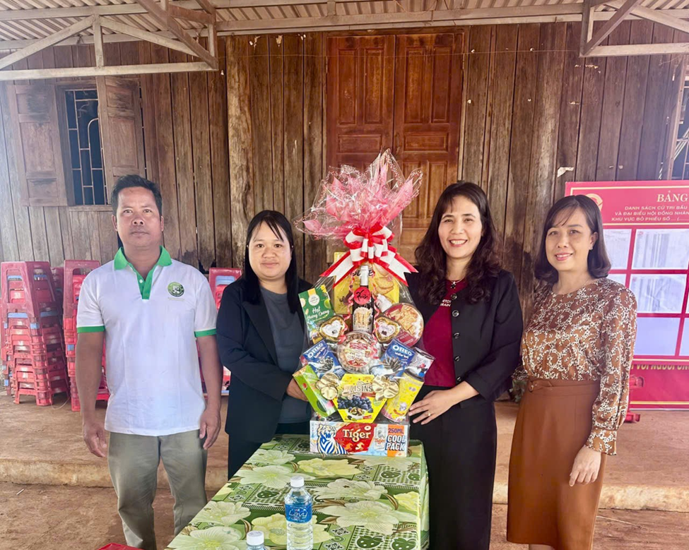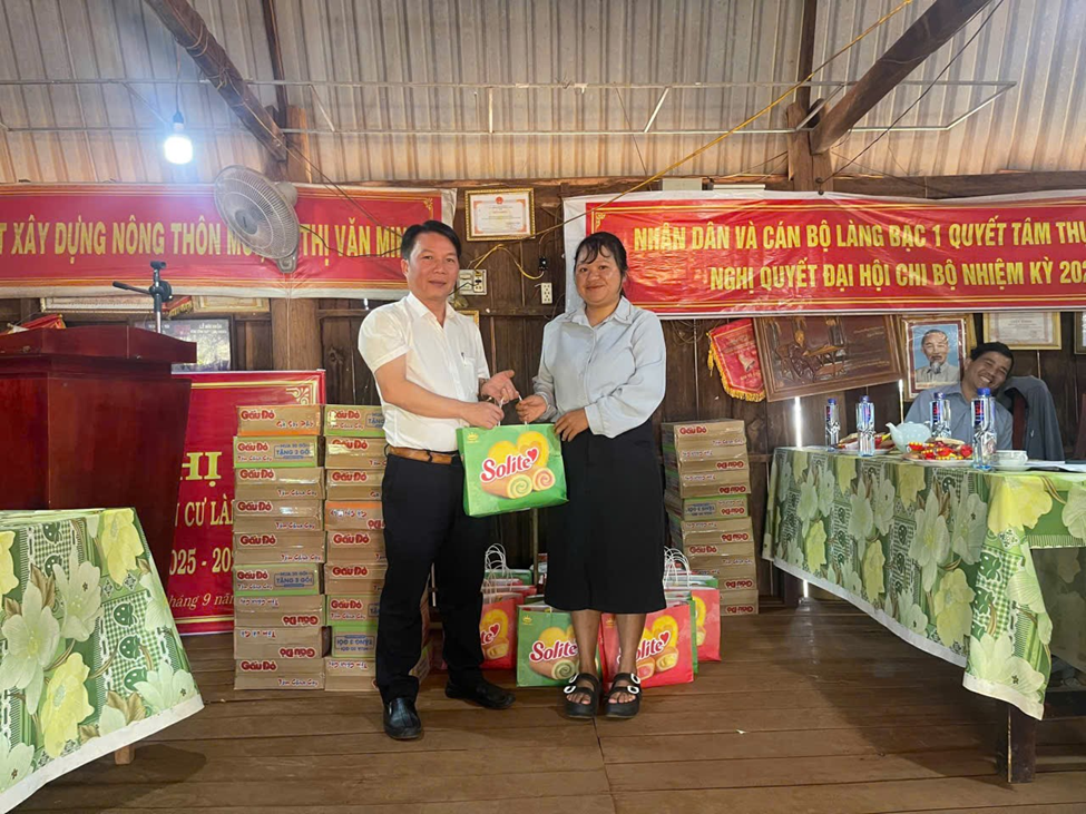 Đồng chí Bác sĩ CKI Huỳnh Thị Kim Trang - Phó Bí thư Đảng ủy, Phó Giám đốc Trung tâm Y tế Chư Prông tặng quà Tết Nguyên đán cho Ban thôn làng Bạc 1